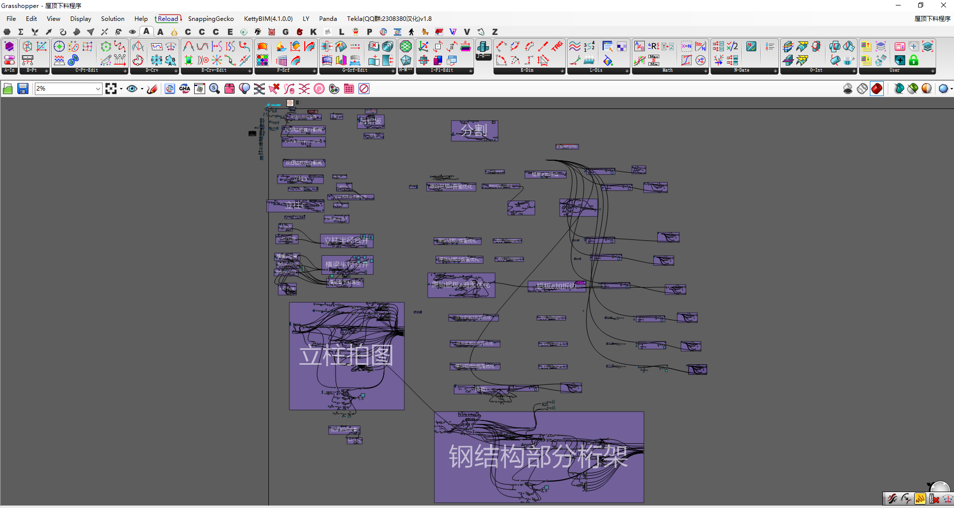 本項(xiàng)目鋁板造型多、曲面鋁板占比大,施工工藝復(fù)雜,對(duì)現(xiàn)場(chǎng)施工措施要求極高,現(xiàn)場(chǎng)需要大量曲臂車及其他特殊設(shè)備進(jìn)行配合,本項(xiàng)目使用吊籃大部分為特殊加工定制,安裝難度較高,項(xiàng)目部同專業(yè)廠家加班加點(diǎn)定制方案,最終一次性通過專家論證,為項(xiàng)目的順利實(shí)施提供保障。施工過程中,我們的項(xiàng)目團(tuán)隊(duì)根據(jù)現(xiàn)場(chǎng)情況和設(shè)計(jì)團(tuán)隊(duì)不斷溝通,不斷地試驗(yàn),參考公司其他體育場(chǎng)館建設(shè)方案和團(tuán)隊(duì)自身技術(shù)經(jīng)驗(yàn),最終完美地將這些節(jié)點(diǎn)一一落實(shí)到位。在施工下料階段,全程采用Rhino+Grasshopper 平臺(tái)結(jié)合編寫的幕墻自動(dòng)化下料系統(tǒng),根據(jù)分格尺寸進(jìn)行平板、單雙曲優(yōu)化,在合理的誤差范圍擬合原G2曲面,板材進(jìn)行扣縫、折邊、開缺,完成加工模型,自動(dòng)與Excel對(duì)接,生成材料清單,并將所需面板、編號(hào)、面積、材質(zhì)、圖號(hào)等加工數(shù)據(jù)信息自動(dòng)輸入。幕墻雙曲龍骨經(jīng)優(yōu)化后模型與圖紙誤差控制1mm左右,全參數(shù)化自動(dòng)生成圖形、尺寸標(biāo)注、參數(shù),保證圖紙準(zhǔn)確無(wú)誤;每一榀龍骨在安裝過程中嚴(yán)格根據(jù)全站儀點(diǎn)位進(jìn)行三維空間定位,模型空間與實(shí)際空間1:1還原。