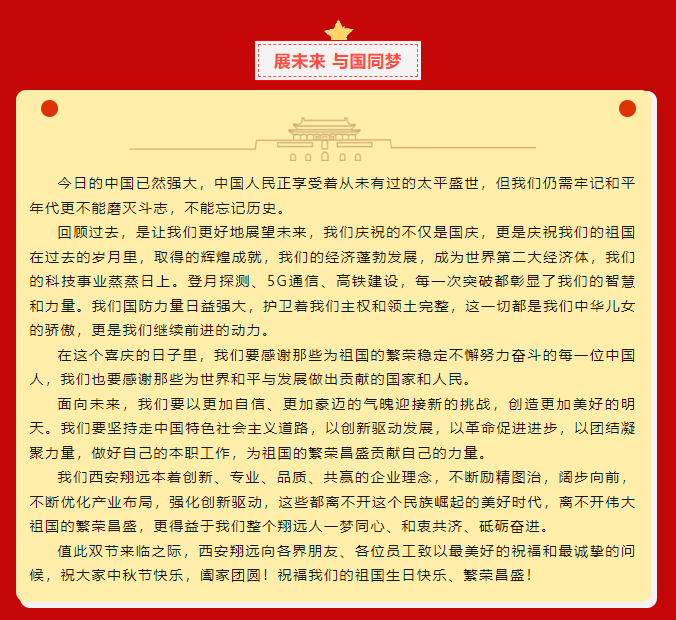 慶盛世華誕,迎金秋滿月,西安翔遠(yuǎn)祝全國人民中秋佳節(jié)闔家團圓!祝福偉大的祖國生日快樂、繁榮昌盛!