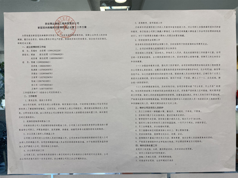 連日來,西安翔遠裝飾工程有限責任公司貫徹落實國家關于疫情防控的部署要求,一手嚴抓疫情防控,一手力推復工復產,開啟“硬核”復工防疫,開始新一年的企業征程。